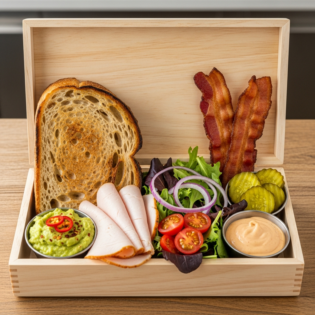 Inside the Deconstructed Sandwich Box, every element is thoughtfully crafted to create a harmonious balance of flavors and textures that excite the palate. This elegant approach to a classic favourite invites you to explore each component individually-crisp, creamy, savory, and fresh-before bringing them together in an inspired assembly that elevates an everyday lunch to a culinary experience.
